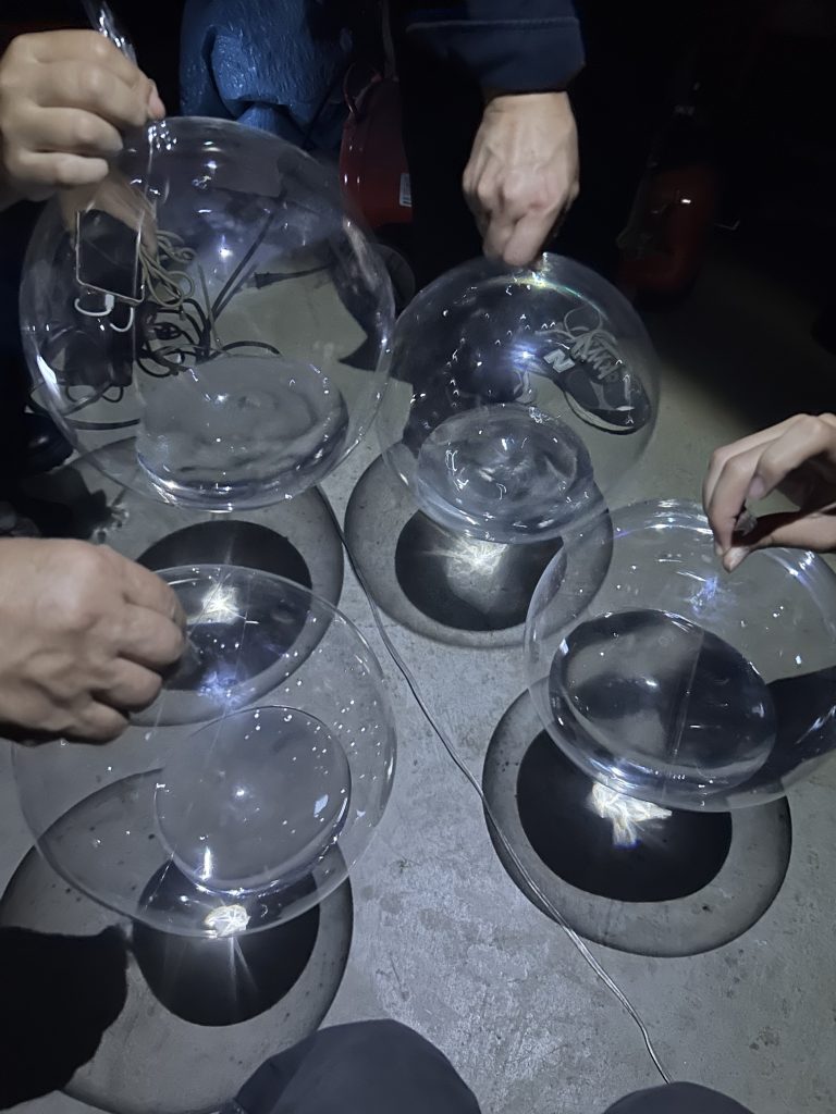 これまで、地域の花火店を巡るフィールドワークや、タッチデザイナーを使った光源の作成、プラスチック半球や偏光板を使った光の変化の検証を重ねてきました。