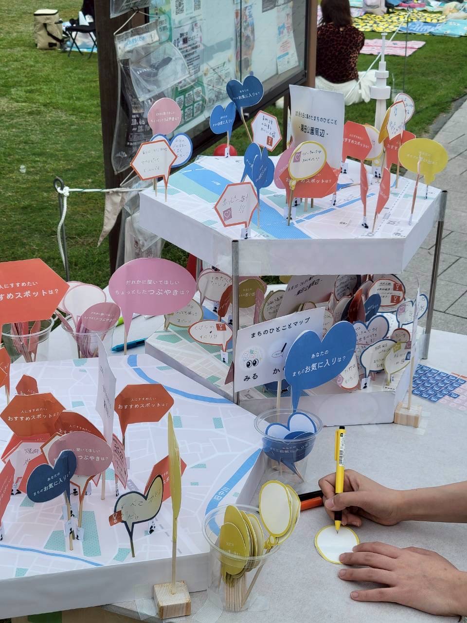参加者には「おすすめスポット」「お気に入りの場所」「ちょっとしたつぶやき」「思い出」を手書きで書いてもらい、マップ上の該当場所にピンで刺してもらいました。