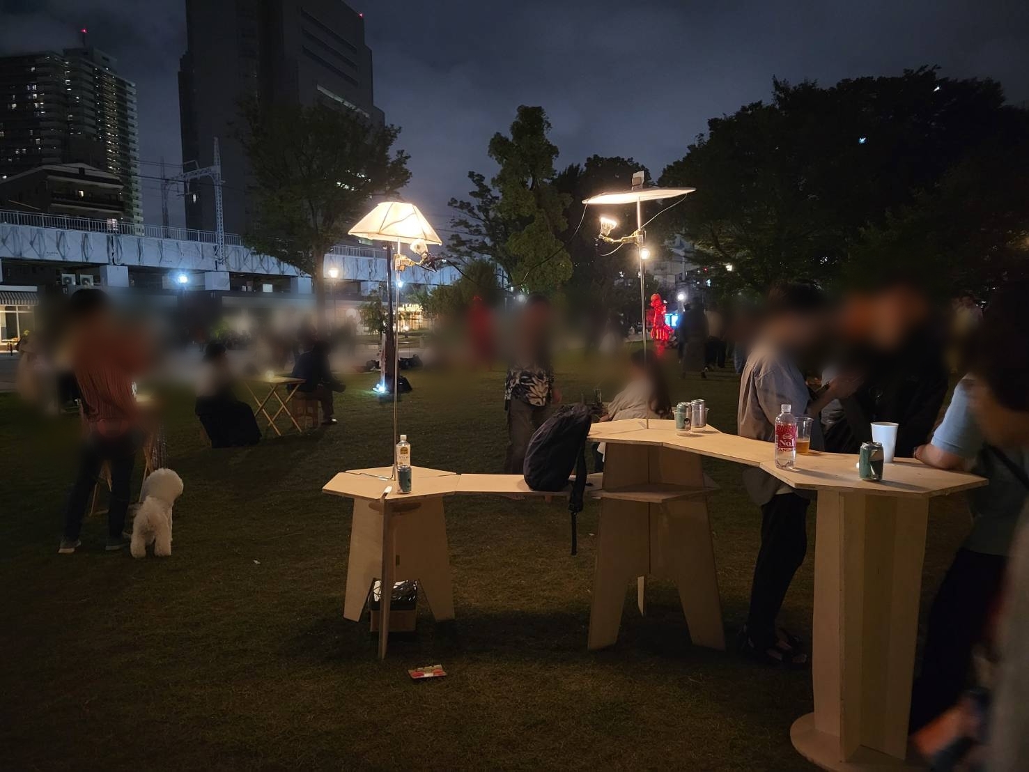 10月には、制作したプロトタイプを月見夜会・コスプレイベント・パークシネマ・すみだジャズの4つのイベントに設置し、人々の滞在行動や交流の生まれ方、テーブルや空間の使い勝手を観察しました。